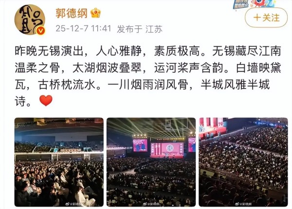 12月7日,郭德纲的一个社交账号上,发出了“昨晚(6日)无锡演出,人心雅静,素质极高”等语,似是以此回应这一传言。