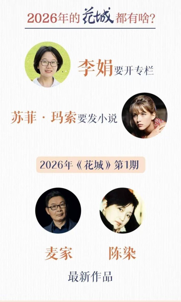 时至今日,苏菲·玛索仍然是众多中国人内心最为熟悉的法国女明星,在《初吻》《芳芳》《007黑日危机》等电影中,“法兰西玫瑰”优雅、率真、自然的形象给观众留下了深刻印象。苏菲·玛索的另一个身份是作家,多年前就出版过作品。她曾经透露,自己多年来一直在秘密地写作。其创作的小说集《隐秘》“书写自己,书写母亲,书写外婆,书写一代又一代女性”,在2024年获得了玛格丽特·德·纳瓦拉文学奖。新的一年,她最新的小说译作将在《花城》与读者见面。《花城》2026年第1期还将推出著名作家、茅盾文学奖获得者麦家的最新中篇小说,以悬疑色彩展示现实题材;陈染被誉为当代文学“一位独特而重要的女性作家”,其短篇小说也将与读者见面。