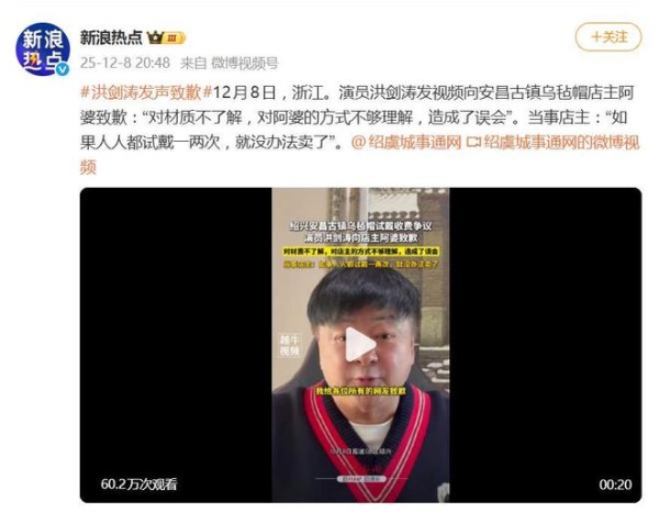 时隔6天,洪剑涛于12月8日发布了道歉视频。他承认自己此前确实不了解乌毡帽的材质特性和易损性,对店主的方式“不够理解造成误会”,并向施奶奶和网友致歉。他也解释称当时未注意到收费标识,但强调“并非故意遮挡”,呼吁公众不要过度解读。