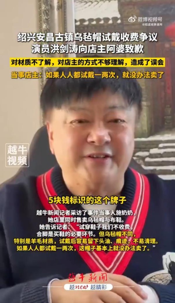 事件起因于12月2日,洪剑涛在浙江安昌古镇游玩时,想试戴当地特色的乌毡帽。店主施奶奶告知,试戴需支付5元费用。对此感到不解的洪剑涛,将过程拍成视频发布上网,瞬间点燃了“试戴收费是否合理”的全民争论。