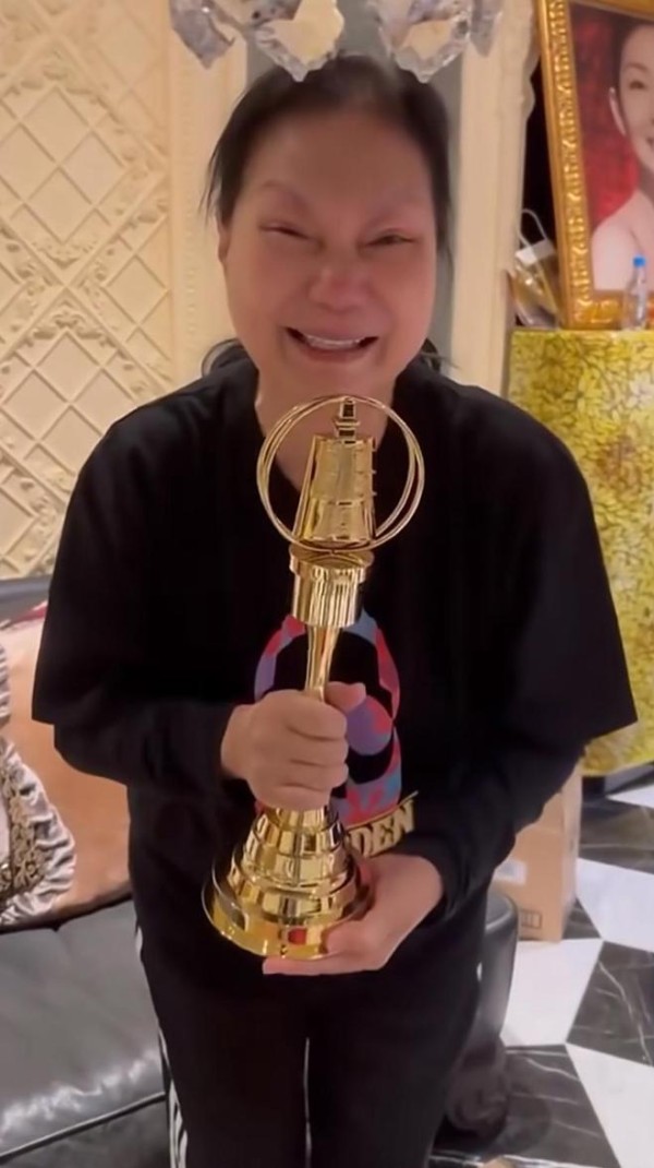 小S把奖杯送给S妈,晒奖杯与全家福合照,S妈手捧奖杯眼含热泪
