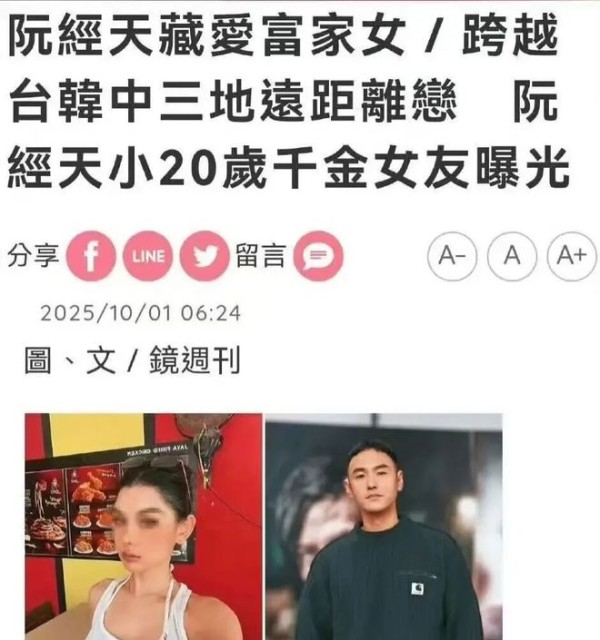 更让人惊讶的是,据传这位神秘女友竟是位小阮经天20岁的千金小姐。随着网友的深入挖掘,一张疑似其女友的照片也悄然在网络上流传开来,照片中的女孩青春靓丽,气质不凡,与阮经天站在一起,年龄差距确实不小。