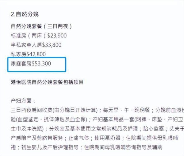 据方力申透露,他与妻子所在的医院,名为港怡医院,通过公开资料结合其晒出的画面来分析,方力申此次为妻子选择的地方应该是家庭套房,且他在叙述的过程中透露是自然分娩,由此推断价格在5万多港币(目前已经出院,推断孩子出生最少三天了)。