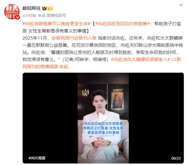 2025年11月,《新民周刊》“新刊人物”栏目对向佐进行了独家专访。近年来,向佐与妻子郭碧婷始终低调投身公益慈善事业,在尼泊尔最偏远贫困的区域,夫妇二人不辞辛劳跋山涉水,全力捐助当地医院中转站的建设。向佐说:“筹建的医院让受伤的人能够及时得到救助,争取生命获救的时间,我觉得很有意义。”