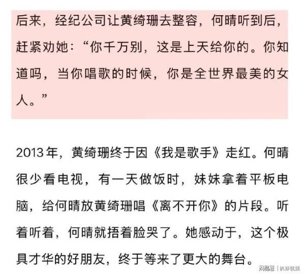2013年,黄绮珊因为音乐节目而彻底走红,以往很少看电视的何晴并不知道,有一天她在做饭时,妹妹给她看黄绮珊在节目上的表现,听着听着,何晴就捂着脸哭了,她无比感动,这位极具才华的好朋友终于得到属于她的大舞台了。