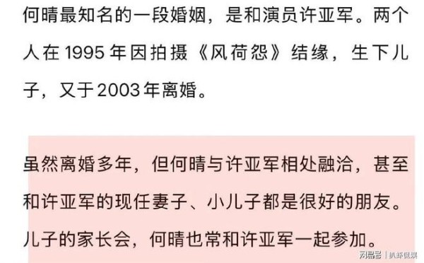 何晴与许亚军在2003年离婚,只是离婚后二人仍以朋友相处,并没有彻底断绝关系,而且何晴与许亚军的现任妻子、小儿子都是很好的朋友,他们经常一起去开家长会。