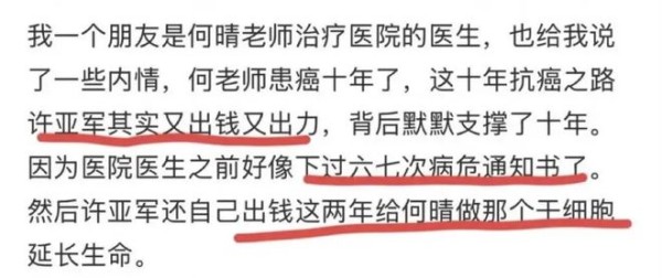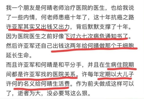 直至何晴治疗医院的医生透露相关情况后,公众才得以了解,许亚军并非冷漠之人,反而尽显重情重义。