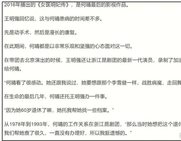 她曾委托老友王明强协助办理,王明强作为何晴在浙江昆剧团的老同事,为处理此事查找相关档案长达三年。