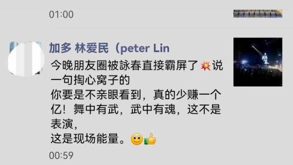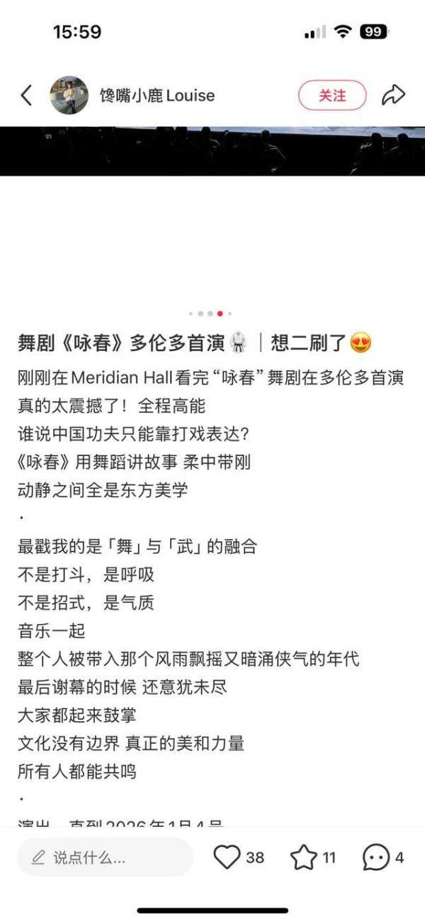 布兰普顿市华商会会长洪雯峰也在朋友圈写起了“小作文”,他感叹:“《咏春》并没有刻意‘讨好海外市场’,而是用中国的方式,讲出了世界的语言。正因如此,它才能在多伦多、乃至全球多个城市引发共鸣——不同文化背景的观众,都能从中读懂‘坚持、传承、修炼与自我超越’。在海外看到这样一部作品,会特别深刻地感受到:真正的文化出海,不是符号输出,而是价值与审美的自然被理解、被尊重。《咏春》做到了。它让世界看到,中华传统文化不仅能看,而且好看、耐看、值得反复回味。为这样的中国舞台作品,感到由衷骄傲。”