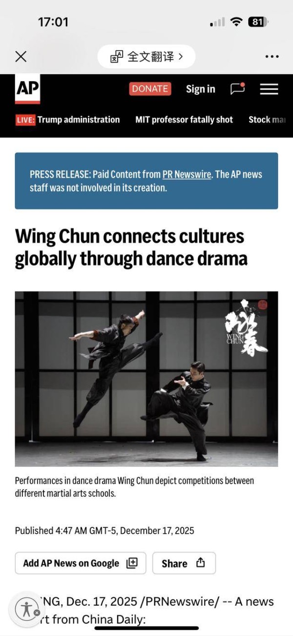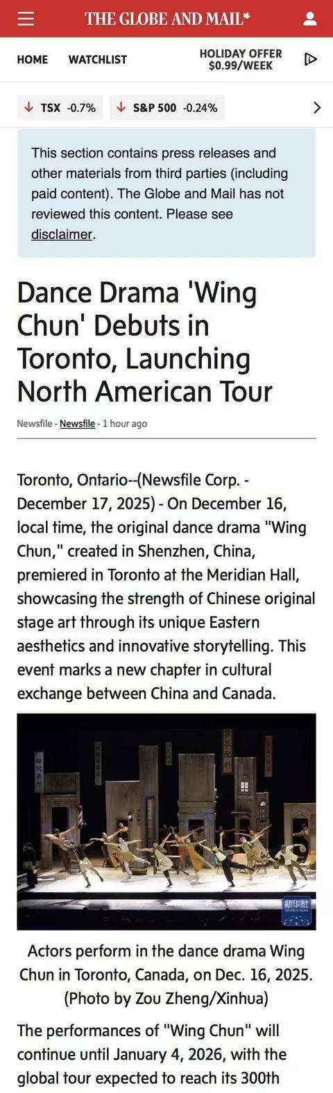 机构媒体、北美主流媒体同样对12月16日晚的《咏春》北美驻演首场演出给予高度关注。美联社以《咏春以文化为桥联通世界》为题发表报道,文章写道:“12月16日晚,深圳原创舞剧《咏春》在加拿大多伦多开启北美首演,赢得观众热烈掌声。”文章还提到:“深圳是一座年轻且富有创新精神的城市,2026年亚太经合组织(APEC)第三十三次领导人非正式会议将在深圳举行。在演出的配套活动中,深圳展示了其创新精神、良好的营商环境和友好的氛围,欢迎更多游客前来参观。”