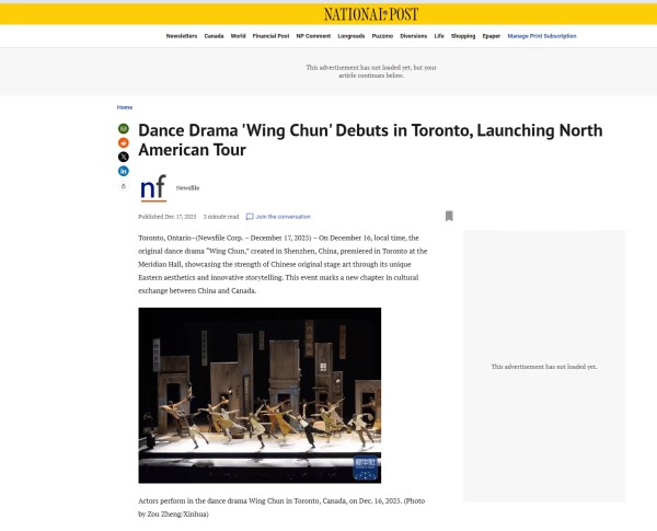 《加拿大邮报》在报道中称:“12月16日晚,中国深圳原创舞剧《咏春》在加拿大多伦多子午线大厅(Meridian Hall)首演,展现了中国原创舞台艺术的独特东方美学和创新叙事,开启了中加文化交流的新篇章。”