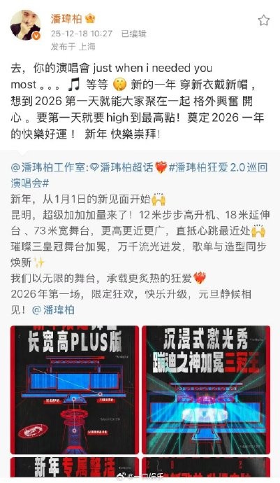 潘玮柏昆明演唱会舞美设计引热议,73米舞台12米升降机挑战体能极限