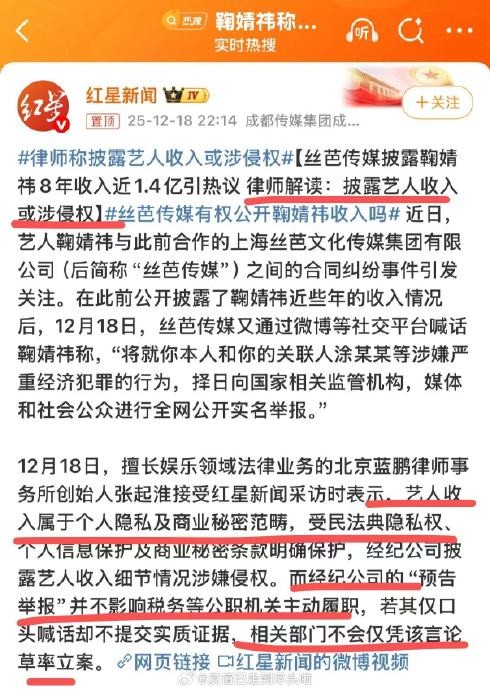 #丝芭传媒有权公开鞠婧祎收入吗#这个行为有可能侵涉及侵权啊不过也是,普通公司还要求员工工资保密呢,这样直接公开了鞠近十年的个人收入,怎么说也是泄漏个人隐私了吧