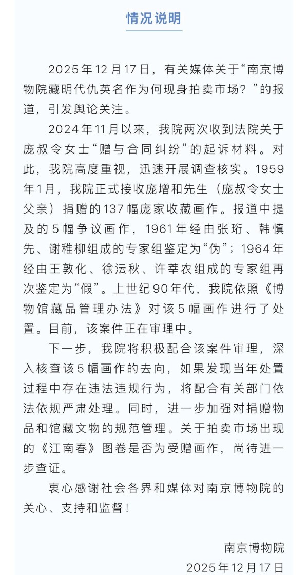 2025年12月17日,南京博物院发布情况通报,称该院依照《博物馆藏品管理办法》对此前经专家组鉴定的5幅争议画作进行了处置,将积极配合案件审理,加强对捐赠物品和馆藏文物的规范管理,同时表示拍卖市场出现的《江南春》图卷是否为受赠画作,尚待进一步查证。