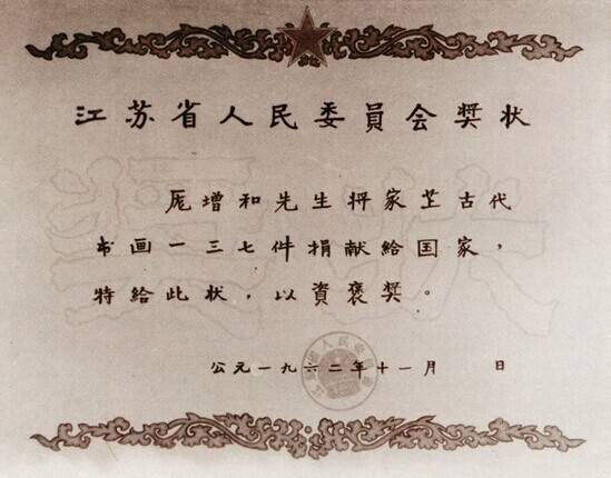 1962年,江苏省人民委员会颁发给庞增和捐赠古代书画137件的奖状。