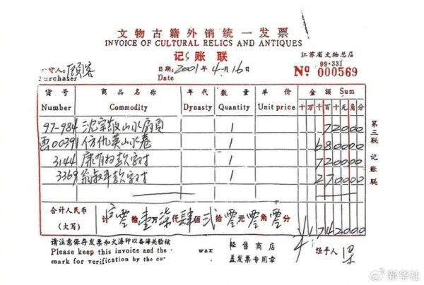 2001年4月16日“顾客”以6800元价格购买《江南春》图卷,销售清单明示为《仿仇英山水卷》。从鉴定为“伪作”到决定划拨、调剂,直至销售,其间庞家人毫不知情。