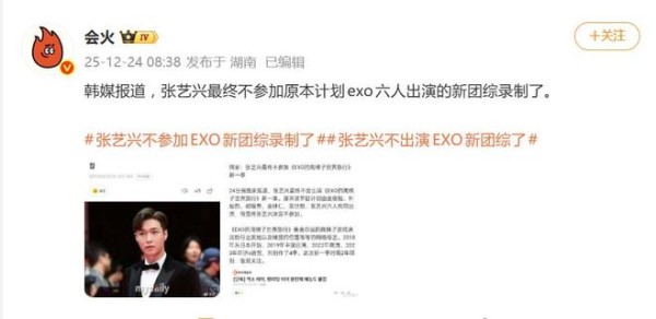 12月24日,韩媒一则“张艺兴确认不参加《EXO的爬梯子世界旅行》新一季录制”的消息,瞬间在粉丝圈里投下了一颗“行程炸弹”。这档原计划由金俊勉、朴灿烈、都暻秀、金钟仁、吴世勋和张艺兴六人合体的经典团综,最终因张艺兴的退出而未能实现“完全体”回归,让不少期待已久的团粉直呼遗憾。
