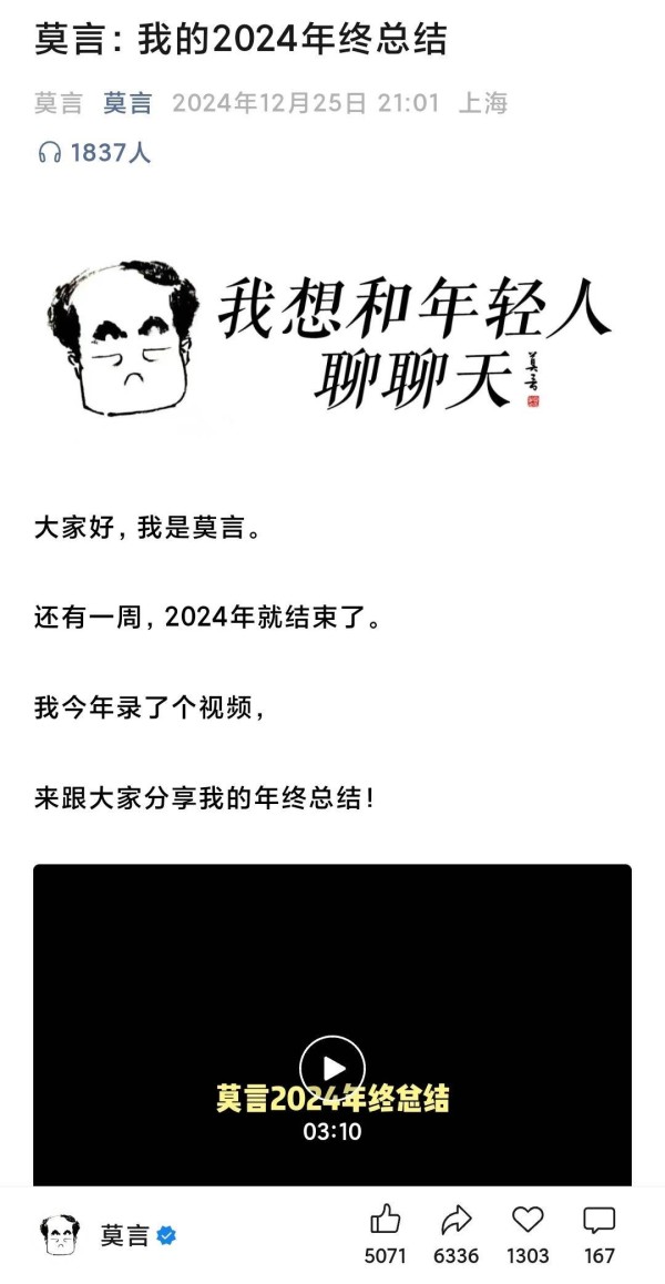12月23日,作家莫言通过短视频平台发布了一篇诚挚而生动的“个人年终总结”。时年七十的他,以“不觉得自己是个老人”的年轻心态,分享了这一年拥抱数字生活、坚持行走世界、深化阅读思考的丰富历程。从拍摄Vlog收获数百万网友互动,到重走契诃夫笔下的土地并钩沉一段跨越中俄的文史脉络,莫言向读者展现出一位写作者依然鲜活的好奇心和“生活与创作并行”的日常。