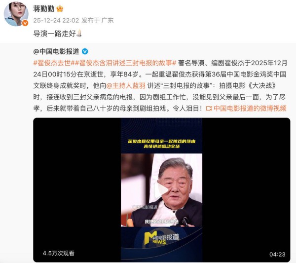 原八一电影制片厂故事片室一级导演翟俊杰,于2025年12月23日与世长辞,享年84岁。贾樟柯、冯远征、蒋勤勤等多位艺人纷纷转发消息,以表悼念之情。