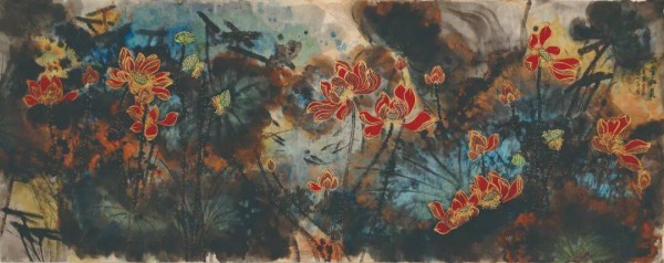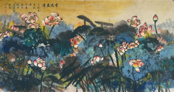 其次,谭作春的岩彩画用色大胆而非常明了。观谭作春的《一堂和气》等岩彩画作品,色调对比非常鲜明、强烈,用色用墨显得“肆无忌惮”,不受条条框框的束缚。天上的云彩——通常是白颜色的,在他的笔下可以变成金黄色;池塘里的莲花——原本是绿色的,在他的笔下可以变成朱红色。他似乎就是想将内心对这个世界美好的真实期望,用那些绚丽的色彩坦诚地呈现出来,从而获得一种源自灵魂深处纯粹的欢愉。他的岩彩画既呈现着西画色彩的典雅明丽之美,又散发着中国画的素婉朴茂之韵,别有一番景象和情调!