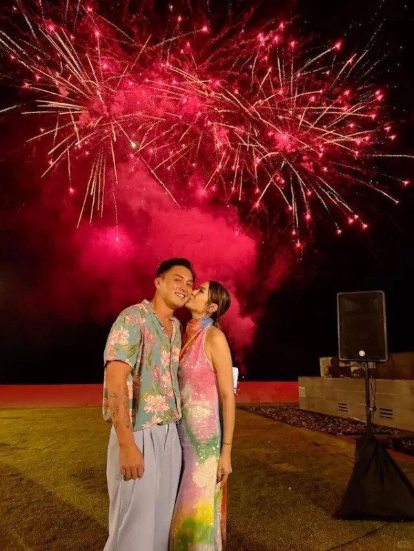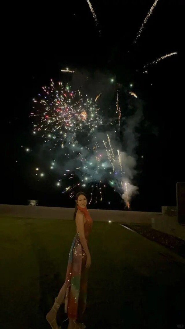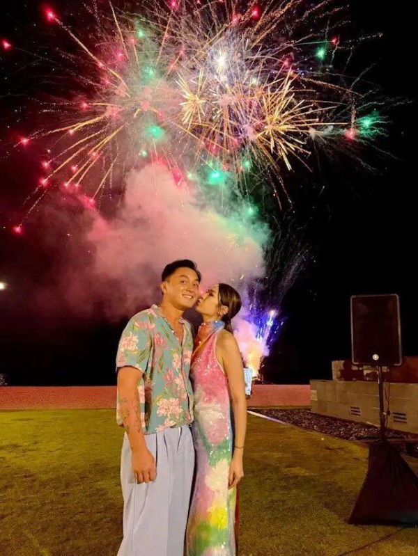庄思明在社交平台分享多张靓相,发文写道:“平安夜快乐,Merry Christmas everyone”。从照片可见,两人应该外出庆祝,悉心打扮穿上情侣色系的服装,身穿露背长裙的庄思明,刻意转身大晒白滑美背,并在璀璨的烟火背景下向杨明连环送吻,画面甜到爆。