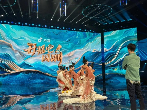 “各位老师点赞破10万,就给大家带来《开播吧,国潮》专业赛道第一名的节目《春江花月夜》。” 主持人冯柏烨话音刚落,舞台左侧的舞者即刻调整姿态。此时,直播大屏显示在线人数已增至5000人。