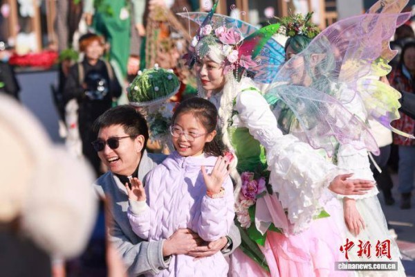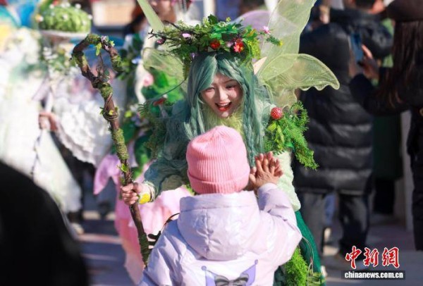 1月2日,元旦假期,乌镇戏剧节开年大巡游——《艾尔夫奇境之旅》在北京城市副中心商业地标——“湾里”上演。图为巡游演员与市民互动合影。中新社记者 贾天勇 摄