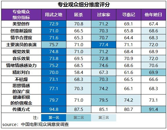 从细分指标评价上看,在普通观众评分体系中,《匿杀》包揽了十项细分指标中的九项最高值,其中故事喜爱度、主要演员的表演、视觉效果、精彩对白均超85分;《过家家》的传播方式居第一,思想深刻性、不枯燥等居第二;《用武之地》的故事喜爱度、视觉效果,《寻秦记》的主要演员的表演、音乐效果等指标居档期第二位。