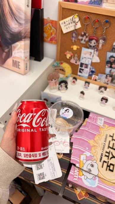 收拾行李,从箱子里翻出来海底捞带过来的可乐,我们那桌真的是非常节制,点了几瓶饮料加一盘韩牛加了我最爱的土豆,和一点蔬菜,后面韩粉吃不够又加了一点东西,然后就想着说都是女生压根吃不了多少,而且整个人见完秀秀肾上腺素飙升根本吃不下,不想浪费钱浪费食物以至于后面吃完要走人看到剩下一瓶可乐,想着这是秀请我喝的可乐,我要带走,打开行李箱靠背真的很想金智秀了这瓶可乐我永远珍藏包括蛋糕盒子也是洗完带回国内了…嗯就有秀秀收藏癖