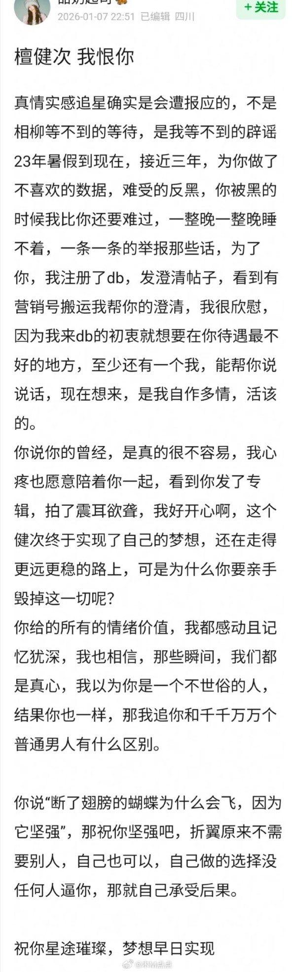檀健次粉丝发布脱粉贴引热议
