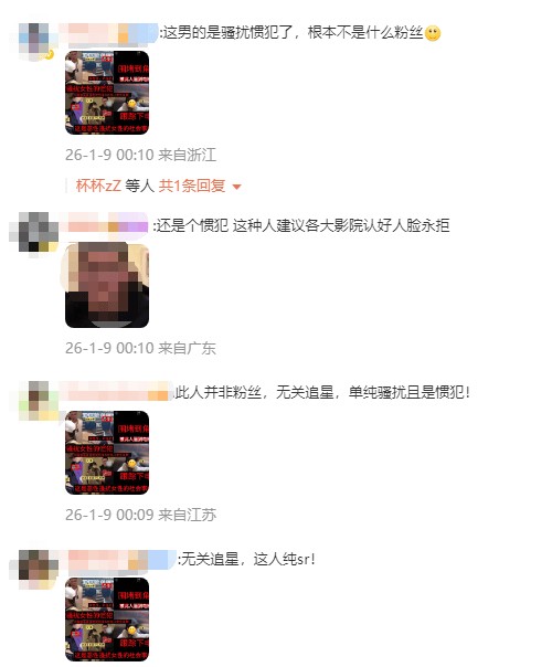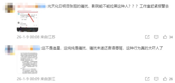 也有网友愤怒表示:“光天化日明目张胆的骚扰,影院能不能拉黑这种人?”“这纯纯是骚扰,骚扰未遂还言语辱骂,这种行为真的太吓人了!”“此人并非粉丝,无关追星。”