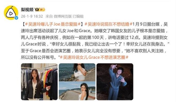 据吴速玲透露,Joe对这段恋情投入度堪称“韩剧级别”。小情侣的日常充满了仪式感:不仅要庆祝在一起的第100天、三个月纪念日,连每日通话都要坚持到午夜12点过后。这种“讲电话要过12点”的执着,让吴速玲都忍不住幽默吐槽,儿子因为恋爱陪伴妈妈的时间变少了,简直是“有了女友就没了娘”。不过她也坦言,这就是Joe真诚热烈的性格体现,并非盲目。
