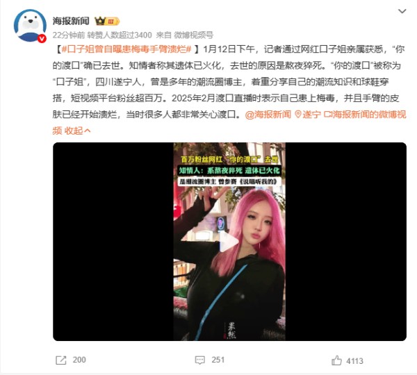 百万粉丝女网红熬夜猝死 曾自曝患上梅毒皮肤溃烂