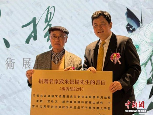 米景扬之子米川(右)向饶宗颐文化馆捐赠22幅米景扬与老一辈名家交往的珍贵书信副本。 罗英杰 摄