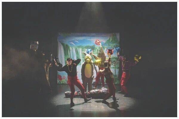 正是在这样的结构中,话剧《鸟寻得》呈现出一个具体而现实的舞台故事:一个女孩如何因为父母的突然离开,学习用童话理解生活和世界。全剧所有演员都戴上面具,肢体以夸张的牵线木偶风格演绎;人正在变形为物,物正在伪装成人。在剧中,与19世纪格林童话并行的,还有当代迪士尼童话。鸟寻得的妈妈是去找自由了——鸟寻得的玩偶,来自《小鹿斑比》的兔子桑普说。可自由在哪里?会在桑普从未去过的故乡迪士尼乐园吗?