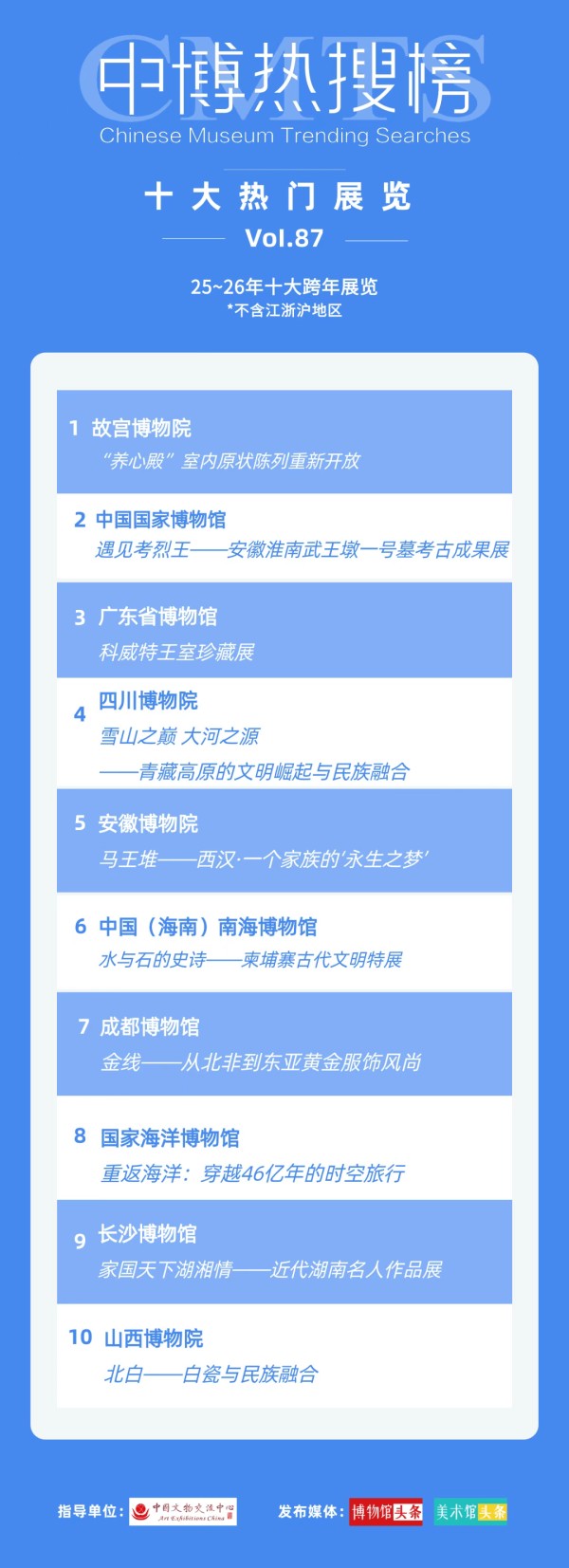 岁末回顾,时光镌刻荣光。这一年,成都博物馆始终与每一位热爱文化的朋友携手同行,以优质的展览、贴心的服务与丰富的文化活动,搭建起连接历史与当下、传统与新潮的桥梁,为大家奉上了一场场浸润心灵的文化盛宴。近期,“中博热搜榜”多项榜单新鲜出炉,我们光荣斩获多项殊荣:成功跻身“2025年度百强热门博物馆市级馆”第二位;在“2025年度第四季度全国热门博物馆百强”中位列第八,“2025年度全国热门博物馆百强”中稳居第九;正在热展的“金线——从北非到东亚的黄金服饰风尚”特展,凭借独特的文化视角、精美的展品呈现与深厚的历史底蕴,强势上榜第Vol.87期“十大热门展览”,成为年度文化打卡的焦点。