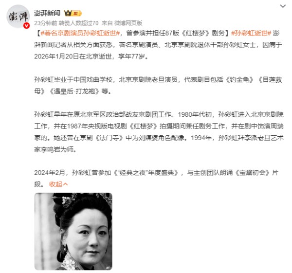 澎湃新闻记者从相关方面获悉,著名京剧演员、北京京剧院退休干部孙彩虹女士,因病于2026年1月20日在北京逝世,享年77岁。