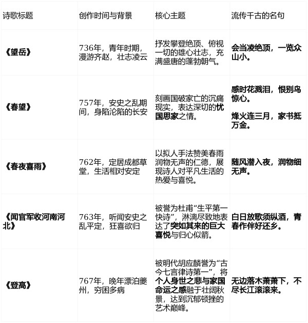 杜甫的诗歌深沉厚重,以下五首是其流传最广、最为人称道的杰作,它们清晰地勾勒出杜甫的人生轨迹与心路历程。