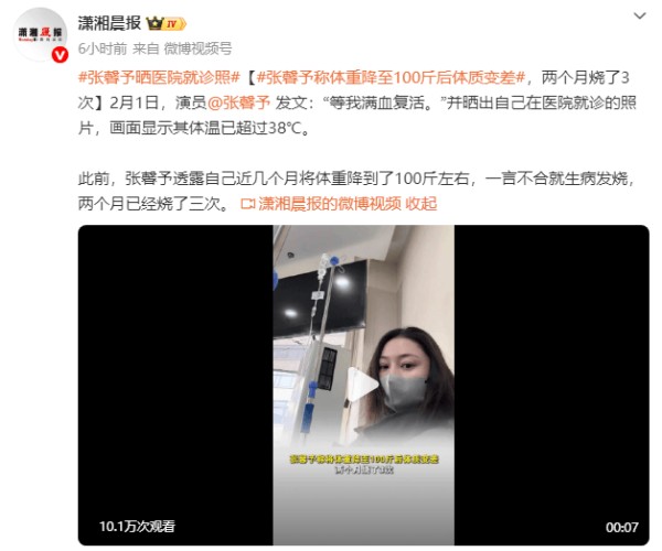 2月1日,张馨予在社交平台发文写道:“等我满血复活”,并配上一张医院就诊时的照片。画面显示,其体温已超过38℃。