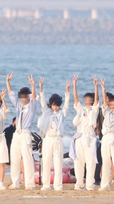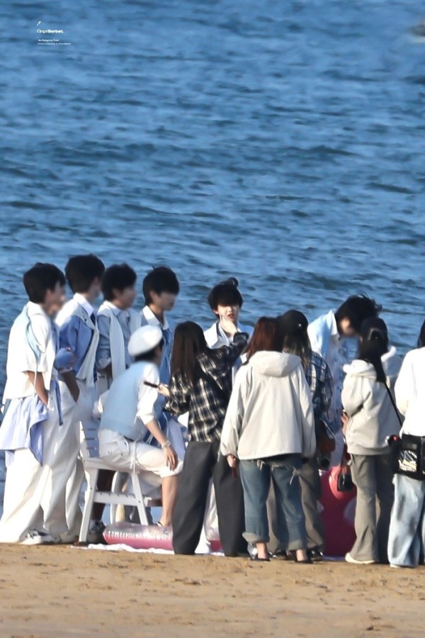 张奕然卷毛造型亮相海边拍摄,脸颊肉感十足