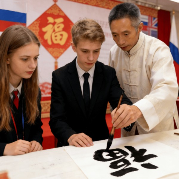 活动期间,最动人的场景莫过于张续周与俄罗斯学生携手共写“福”字——他身着中式雅服,手把手指导俄罗斯学生握笔、运墨,耐心讲解“福”字的文化内涵与书写技巧,从甲骨文中“双手捧酒祭天”的原始意象,到如今“五福临门”的吉祥寓意,让学生们在笔墨实践中读懂中国“福”文化的千年传承。一笔一画间,汉字的灵动与中俄青年的情谊相融,墨香袅袅中,东方文化的魅力悄然传递。