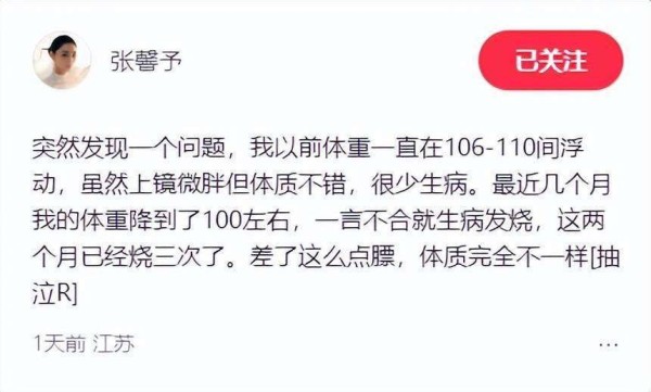 张馨予自曝减重后体质变差!两个月发烧三次,晒就诊照体温超38度