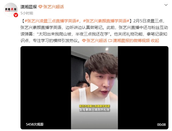 2月5日凌晨三点,张艺兴直播学英语,全程素颜,边听边认真做笔记。此前,张艺兴直播中还与粉丝互动读弹幕:“太阳出来我爬山坡,半夜三点我还在学”。他拿笔记录知识点,专注学习的模样引发讨论。