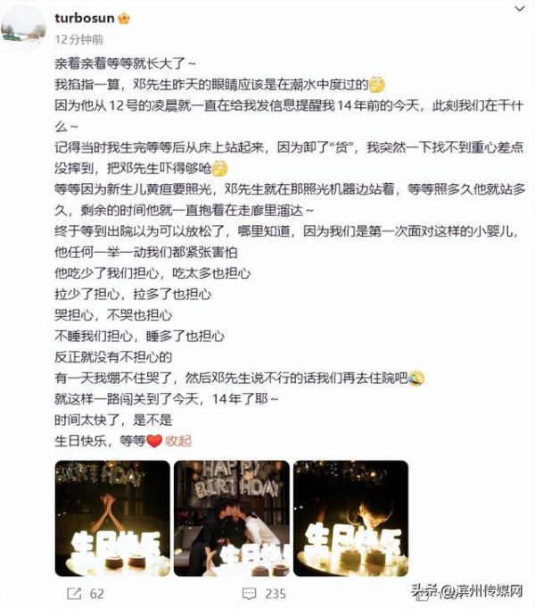 去年11月13日,孙俪发长文为儿子等等庆祝14岁生日,并晒出一家三口合照。