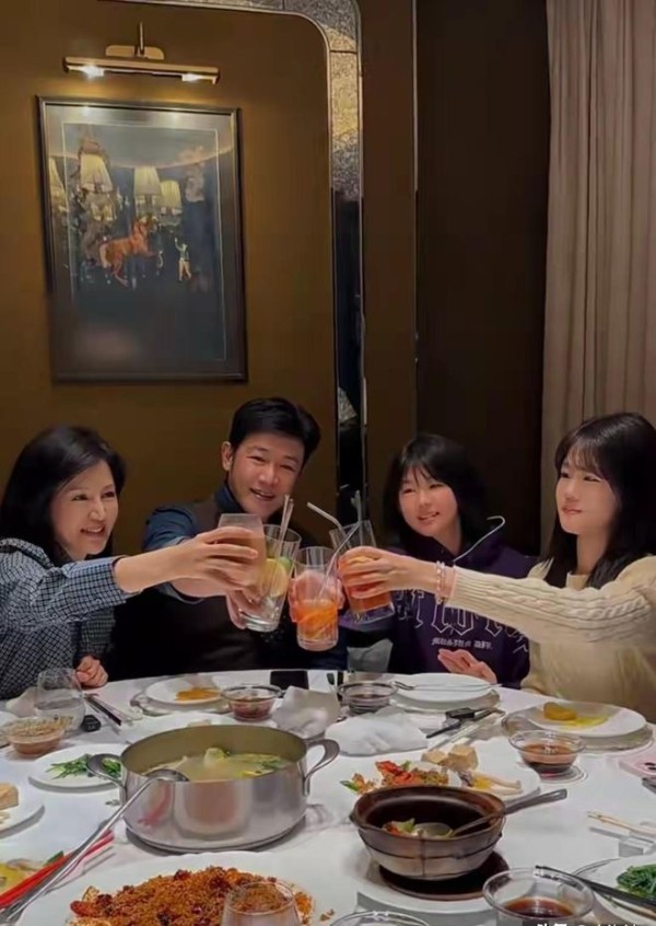 陆毅鲍蕾晒家庭聚餐,四人举杯迎接新年,两个女儿如花似玉