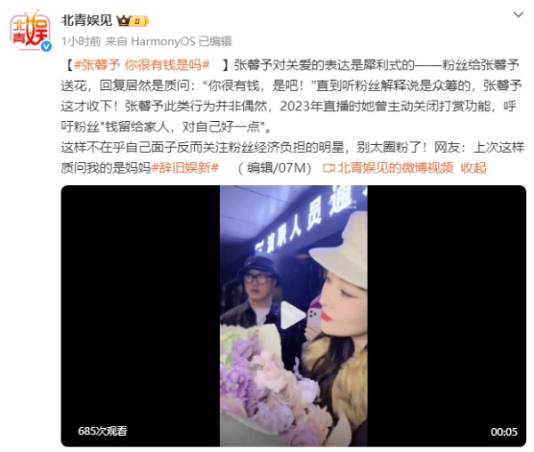 粉丝送花被张馨予犀利反问:你很有钱是吧?