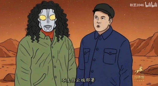 开场宣传片就很“鬼畜”,东北鱼头人带着乡亲们把三角龙和飞天翼龙做成了年夜饭,视觉风格在乡土纪实与科幻怪诞之间反复横跳;语言类节目主打“恶搞”,马斯克换上赵本山的深蓝棉袄皮肤,在火星上与奥特曼耍贫嘴,其笑点源于跨文化IP的魔幻错位;而AI反催婚节目简直是“赛博嘴替”,大模型有理有据逐条反击亲戚灵魂拷问,谁能想到被日常吐槽的春晚有一天也能被爆改成《春晚和Ta的朋友们》!