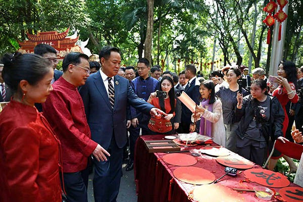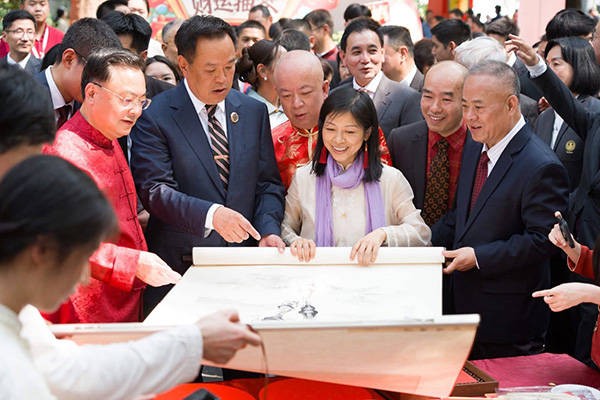 聂晖为阿努廷总理夫人塔娜侬创作了“惠风和畅”团扇。整个活动期间她都爱不释手,扇不离人。