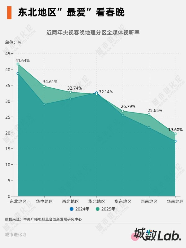 从近两年数据看,东北地区2024年、2025年央视春晚全媒体视听率蝉联全国第一,分别为38.7%、41.64%;包括湖北、湖南、河南在内的华中地区2025年视听率34.61%、排名第二,也是视听率增长(5.67个百分点)最多的地区。此外,2025年华北地区视听率为32.14%,微降0.41个百分点;华南地区视听率最低,为19.6%。