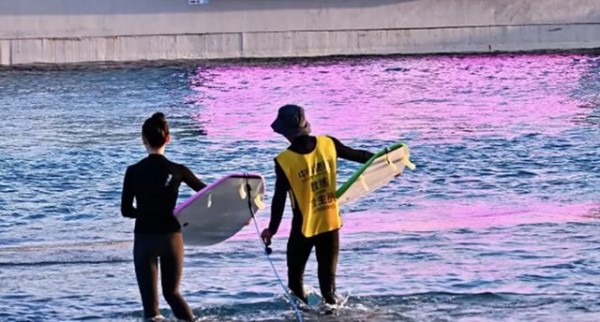 再看洪尧,他身穿一套紫色长袖紧身潜水服,搭配黑色长裤,一身穿搭凸显出良好的肌肉线条与运动体态。相比妻子,洪尧看起来并不是冲浪新手,手持白色冲浪板的他正从浅水区走向岸边,步伐稳健,周围溅起的水花,展现出刚完成冲浪活动的动态感。
